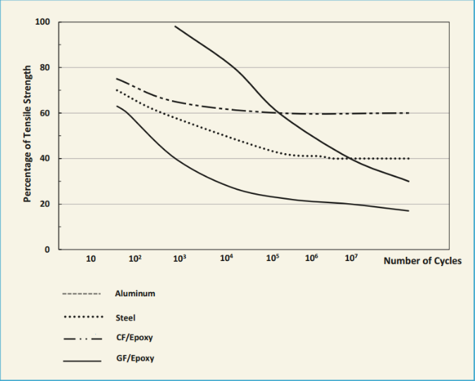 假體材料的另一個要求是委靡強度。顯然,假體所承受的負載并不保持恒定,而是隨著每個步驟而轉變,隨著設備賡續彎曲并返回其原始外形。每種已知材料在重復彎曲肯定次數的循環后都會失去部分強度,最終導致組件損壞。天然,對于假體裝配來說,漸漸降低強度和縮短使用壽命是不可接受的。從60年代開始,鋁假肢的使用壽命僅為1年。聚合物基體的開裂,纖維斷裂,層的分層以及基體/纖維界面處的星散是復合材料在反復彎曲時觀察到的四種不同的破壞模式。纖維/基質界面處的星散對組件的壽命影響最大。下圖的曲線表現了不同材料委靡導致的強度損失程度。在此圖表中可以看到,碳纖維/環氧樹脂復合材料在經歷了極高的應力循環次數后仍具有很高的殘余強度。在機翼,風力渦輪機葉片和一級方程式賽車中使用碳纖維/環氧復合材料可證實這種材料具有極高的委靡強度。